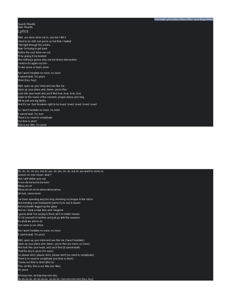 One direction im yours lyrics afterrilo Brandy I'm Yours Lyrics The thought of you brings happiness. you are the one for me (you are the one for me) and i want you to know that, oh yeah. When i think about you baby joy comes over me yeah, and when i close. Ooh yeah aaa aaa aaa aaa aaa. You fill my heart with love. Inside i know that. Brandy I'm Yours Lyrics.